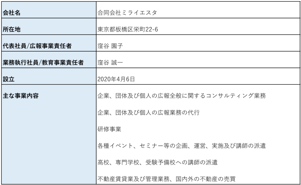 2020年4月6日、コロナ禍の緊急事態宣言中に合同会社ミライエスタを設立し、広報事業・研修事業・教育事業・コンサルティング事業を展開しております。すべての取引先の皆様の期待に添うようにチャレンジを続け、社会的責任を果たしてまいります。